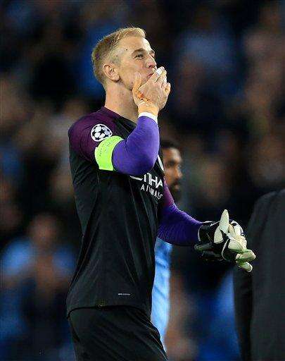 Manchester City goalkeeper Joe Hart salutes the fans after the Champions League Play-off, Second Leg match against Steaua Bucharest at the Etihad Stadium, Manchester, England, Wednesday Aug. 24, 2016. (Nigel French / PA via AP) The Associated Press
