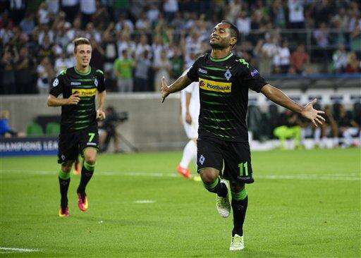 Gladbach's Raffael, right, celebrates scoring the second goal for his team during their Champions League Qualification playoff round second leg match between German Club Borussia Moenchengladbach and Swiss Club BSC Young Boys Bern, at the Borussia Park Stadium in Moenchengladbach, Germany, Wednesday, Aug. 24, 2016. (Manuel Lopez/Keystone via AP) The Associated Press