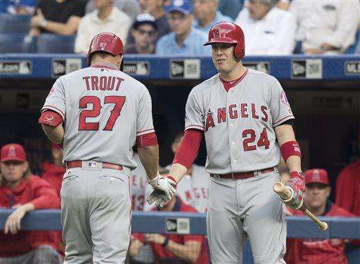Los Angeles Angels' Mike Trout, left, is congratulated by C.J. Cron after he hit a solo home run against the Toronto Blue Jays during the first inning of a baseball game Wednesday, Aug. 24, 2016, in Toronto. (Fred Thornhill/The Canadian Press via AP) The Associated Press