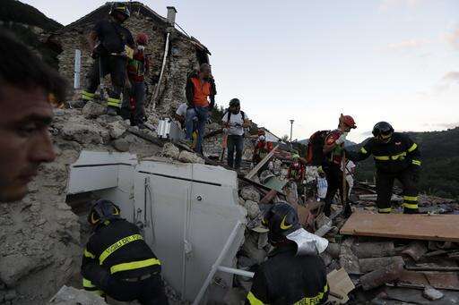 Firefighters and rescue crews using sniffer dogs worked in teams around the hard-hit areas in central Italy, pulling chunks of cement, rock and metal from mounds of rubble where homes once stood. Rescuers refused to say when their work would shift from saving lives to recovering bodies, noting that one person was pulled alive from the rubble 72 hours after the 2009 quake in the nearby town of L'Aquila.