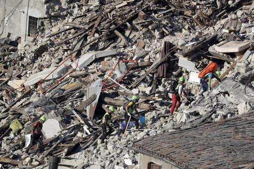 Rescuers search amid the rubble following an earthquake in Pescara Del Tronto, Italy, Thursday, Aug. 25, 2016. A strong earthquake struck on Wednesday and was felt across a broad swath of central Italy, including Rome, where residents woke to a long swaying followed by aftershocks. (AP Photo/Gregorio Borgia) The Associated Press