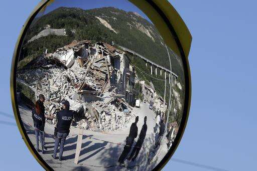 Italian Policemen are reflected on a mirror as they patrol near a destroyed house following an earthquake in Pescara Del Tronto, Italy, Thursday, Aug. 25, 2016. The magnitude 6 quake struck Wednesday at 3:36 a.m. (0136 GMT) Wednesday, and was felt across a broad swath of central Italy, including Rome where residents of the capital felt a long swaying followed by aftershocks. (AP Photo/Gregorio Borgia) The Associated Press