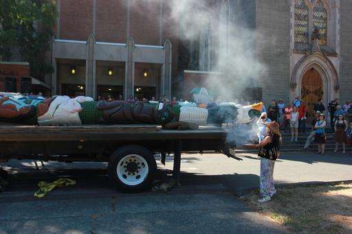 To the sounds of drums and a prayer song, the 22-foot-tall totem pole was blessed in a smudge ceremony at the entrance of Saint Mark's Episcopal Cathedral in Seattle Thursday. Lummi Nation member Linda Soriano fanned smoke from burning sage, covering the pole in a haze as sun rays beamed down. She then fanned the smoke through the crowd gathered outside the church.
