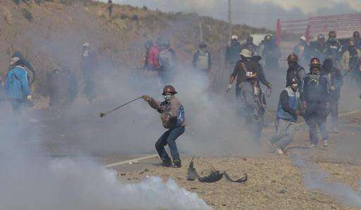 Independent miners clash with the police as they run from clouds of tear gas during protests in Panduro, Bolivia, Thursday, Aug. 25, 2016. Thousands of independent miners continued their protests with roadblocks which precipitated the clashes as the police attempted to dislodge them. (AP Photo/Juan Karita) The Associated Press
