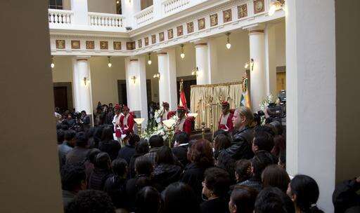 Mourners gather before the coffin containing the remains of Bolivia's Deputy Minister of Internal Affairs Rodolfo Illanes, during a Mass inside the government palace in La Paz, Bolivia Friday, Aug. 26, 2016. Striking Bolivian miners kidnapped and beat to death Illanes Thursday, in a shocking spasm of violence following weeks of tension over dwindling paychecks in a region hit hard by falling metal prices. The miners were demanding they be allowed to work for private companies, who promise to put more cash in their pockets. (AP Photo/Juan Karita) The Associated Press