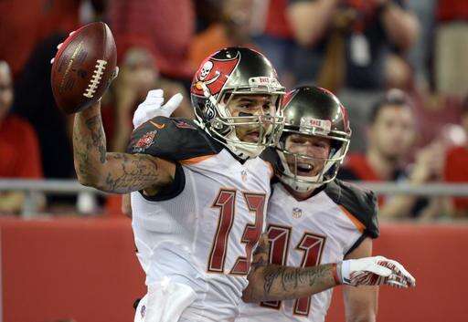 Tampa Bay Buccaneers wide receiver Mike Evans (13) celebrates with wide receiver Adam Humphries (11) after Evans caught a 34-yard touchdown pass against the Cleveland Browns during the second quarter of an NFL preseason football game Friday, Aug. 26, 2016, in Tampa, Fla. (AP Photo/Jason Behnken) The Associated Press