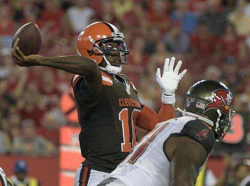 Cleveland Browns quarterback Robert Griffin III (10) throws a pass against the Tampa Bay Buccaneers during the first quarter of an NFL football game Friday, Aug. 26, 2016, in Tampa, Fla. (AP Photo/Phelan M. Ebenhack) The Associated Press