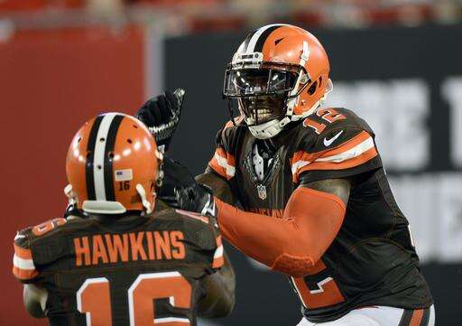 Cleveland Browns wide receiver Josh Gordon (12) celebrates with wide receiver Andrew Hawkins (16) after his 43-yard touchdown reception against the Tampa Bay Buccaneers during the second quarter of an NFL preseason football game Friday, Aug. 26, 2016, in Tampa, Fla. (AP Photo/Jason Behnken) The Associated Press