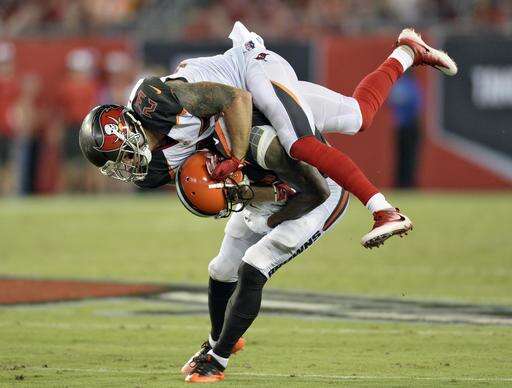 Tampa Bay Buccaneers strong safety Chris Conte (23) jumps on Cleveland Browns wide receiver Terrelle Pryor (11) after a reception during the second quarter of an NFL preseason football game Friday, Aug. 26, 2016, in Tampa, Fla. (AP Photo/Jason Behnken) The Associated Press