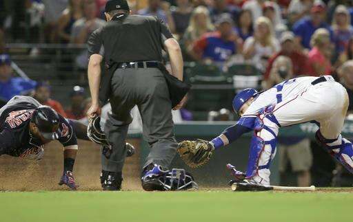 Cleveland Indians' Carlos Santana, left, is tagged out at home plate by Texas Rangers catcher Jonathan Lucroy, right, as umpire Lance Barrett watches during the fourth inning of a baseball game in Arlington, Texas, Friday, Aug. 26, 2016. (AP Photo/LM Otero) The Associated Press