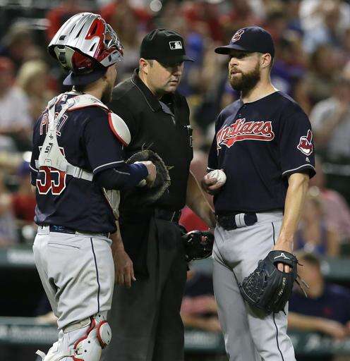 Cleveland Indians starting pitcher Corey Kluber, right, and catcher Roberto Perez (55) chat with umpire Lance Barrett during the fourth inning of a baseball game against the Texas Rangers in Arlington, Texas, Friday, Aug. 26, 2016. (AP Photo/LM Otero) The Associated Press
