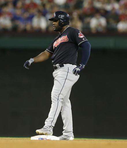 Cleveland Indians' Abraham Almonte stands on second base after hitting an RBI double during the fourth inning of a baseball game against the Texas Rangers in Arlington, Texas, Friday, Aug. 26, 2016. (AP Photo/LM Otero) The Associated Press
