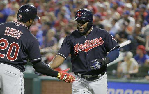 Cleveland Indians Abraham Almonte, right, celebrates with Rajai Davis after scoring on a single by Roberto Perez during the sixth inning of a baseball game against the Texas Rangers in Arlington, Texas, Friday, Aug. 26, 2016. The Indians won 12-1. (AP Photo/LM Otero) The Associated Press
