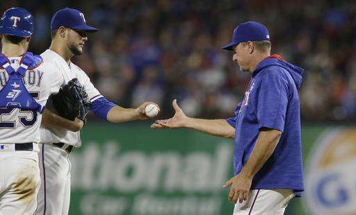 Texas Rangers manager Jeff Banister, right, pulls starting pitcher Martin Perez from the baseball game as catcher Jonathan Lucroy (25) stands by during the sixth inning against the Cleveland Indians in Arlington, Texas, Friday, Aug. 26, 2016. (AP Photo/LM Otero) The Associated Press