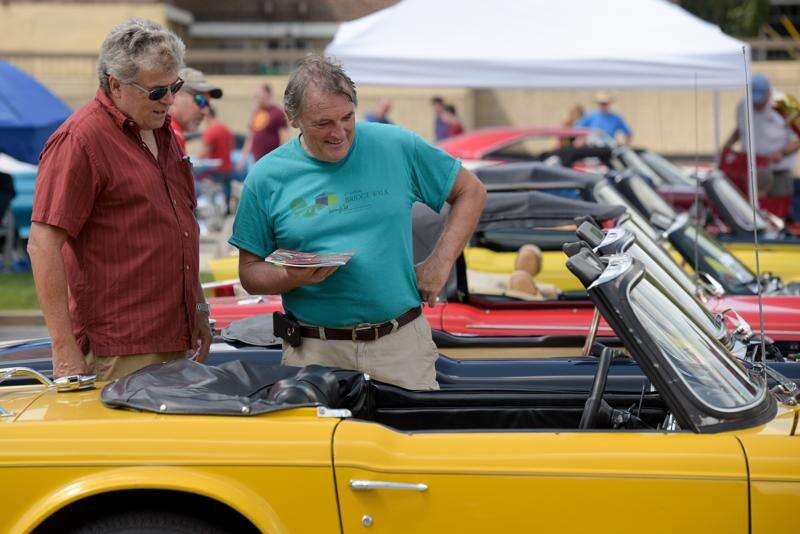 Neighbors Mike Garcia and Greg Giel from Geneva check out a classic Triumph on Sunday at the annual Concours d'Elegance Car Show in downtown Geneva. Mark Black/mblack@dailyherald.com