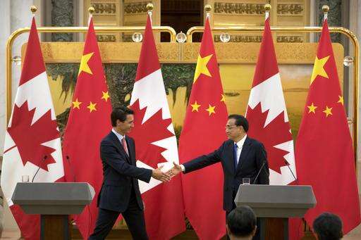 Canada's Prime Minister Justin Trudeau, left, and China's Premier Li Keqiang, right, shake hands at the end of a joint press conference at the Great Hall of the People in Beijing, Wednesday, Aug. 31, 2016. (AP Photo/Mark Schiefelbein) The Associated Press
