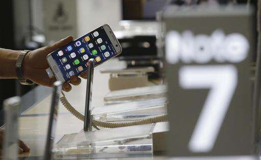 A Samsung Electronics Galaxy Note 7 smartphone is displayed at the headquarters of South Korean mobile carrier KT in Seoul, South Korea, Friday, Sept. 2, 2016. Samsung will issue a global recall of the Galaxy Note 7 smartphone as soon as this weekend after its investigation on explosion claims found batteries were at fault, according to South Korea's Yonhap News. (AP Photo/Ahn Young-joon) The Associated Press