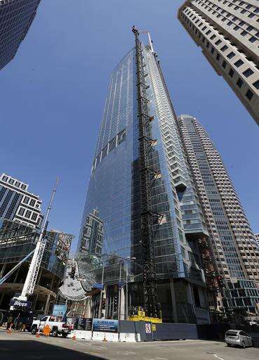 A 160-foot spire is seen atop the Wilshire Grand Tower building after a crane hoisted it into place early Saturday, Sept. 3, 2016, in downtown Los Angeles. The 10-ton spire makes the building the tallest building west of the Mississippi River. It's now 1,099 feet high, 81 feet higher than the nearby U.S. Bank Tower, lower right, which held the tallest building record since 1989. The $1-billion hotel and office complex is scheduled to open next March. (AP Photo/Reed Saxon) The Associated Press