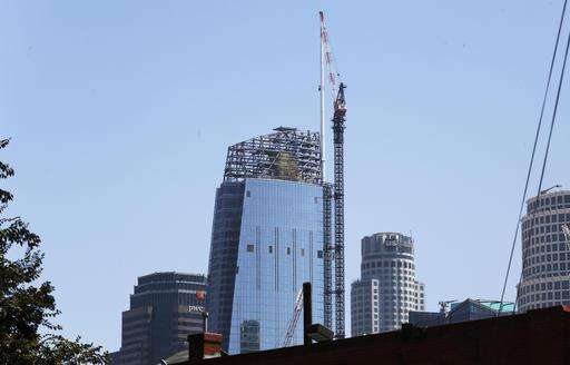 A 160-foot spire is seen atop the Wilshire Grand Tower building after a crane hoisted it into place early Saturday, Sept. 3, 2016, in downtown Los Angeles. The 10-ton spire makes the building the tallest building west of the Mississippi River. It's now 1,099 feet high, 81 feet higher than the nearby U.S. Bank Tower, which held the tallest building record since 1989. The $1-billion hotel and office complex is scheduled to open next March. (AP Photo/Reed Saxon) The Associated Press
