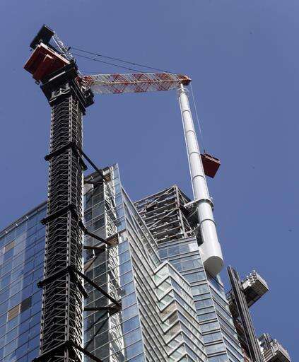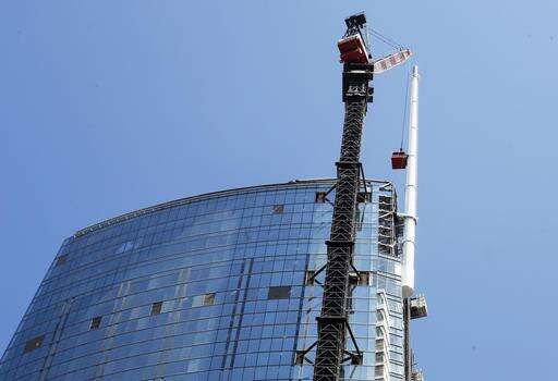 In this photo provided by the Wilshire Grand Center, a crane hoists a beacon into place atop a 160-foot spire on the Wilshire Grand Tower early Saturday, Sept. 3, 2016, in downtown Los Angeles. The 10-ton spire makes the structure the tallest building west of the Mississippi River. The $1 billion hotel and office complex is scheduled to open next March. (Gary Leonard/Wilshire Grand Center via AP) The Associated Press