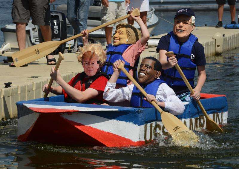 Siblings Luke Knutson, 15, of Mundelein, as Donald Trump; Roy, 12, as Barack Obama; Jill, 10, as Hillary Clinton; and Max, 13, as Bernie Sanders guide their boat, Campain, during the 15th annual Labor Day Cardboard boat Races at Lindy's Landing in Wauconda Saturday. Joe Lewnard/jlewnard@dailyherald.com