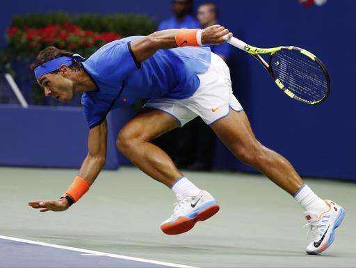 Rafael Nadal, of Spain, struggles to maintain his footing during play against Lucas Pouille, of France, during the fourth round of the U.S. Open tennis tournament, Sunday, Sept. 4, 2016, in New York. (AP Photo/Alex Brandon) The Associated Press