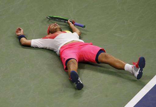 Lucas Pouille, of France, falls backward after beating Rafael Nadal, of Spain,during the fourth round of the U.S. Open tennis tournament, Sunday, Sept. 4, 2016, in New York. (AP Photo/Alex Brandon) The Associated Press