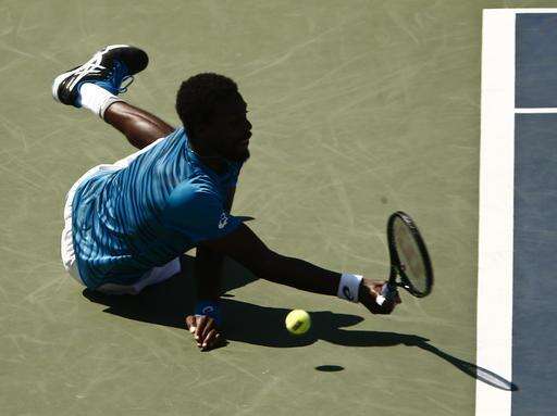 Gael Monfils, of France, falls trying to return a shot against Marcos Baghdatis, of Cyprus, during the fourth round of the U.S. Open tennis tournament, Sunday, Sept. 4, 2016, in New York. (AP Photo/Andres Kudacki) The Associated Press