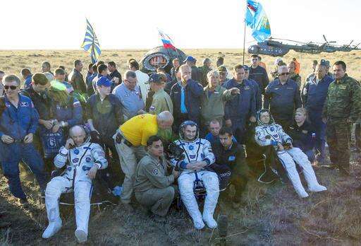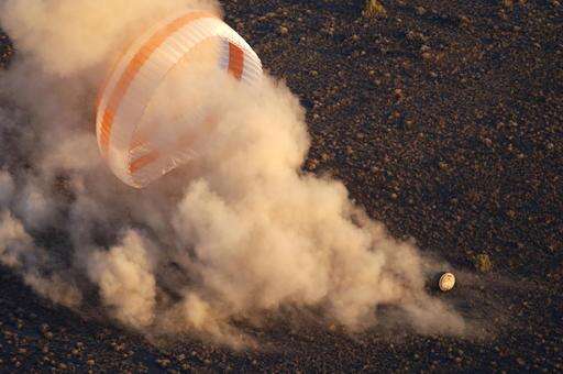 The trio undocked from the space station nearly three and a half hours before touchdown in hazy sunshine with a comfortable welcome home temperature around 66 degrees (19 degrees Celsius) about 90 miles (145 kilometers) southeast of Zhezkazgan in Kazakhstan. They landed thanks to a large orange and white parachute and last second engine firings. NASA spokesman Dan Huot called it a "picturesque landing" on a picture-perfect day.