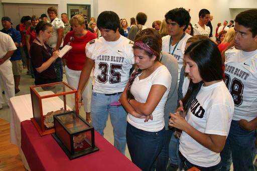 At Flour Bluff Junior High School in Corpus Christi, Texas, students from an officer training program stand guard each September alongside Trade Center steel displayed near the cafeteria. Bruce Chaney, the naval science instructor who applied for the artifacts, brings another, smaller piece to his classes.