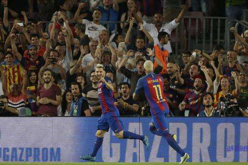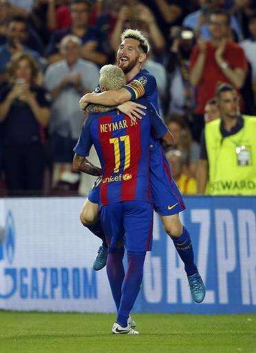 Barcelona's Lionel Messi, left, celebrates with Barcelona's Neymar after scoring the opening goal during a Champions League, Group C soccer match between Barcelona and Celtic, at the Camp Nou stadium in Barcelona, Spain, Tuesday, Sept. 13, 2016. (AP Photo/Emilio Morenatti) The Associated Press