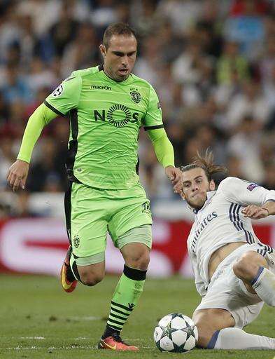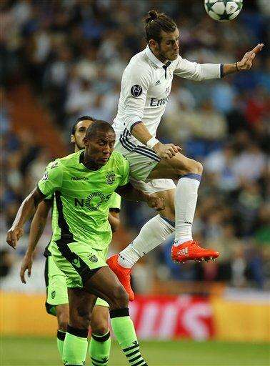 Sporting's Bruno Cesar, left, and Real Madrid's Gareth Bale vie for the ball during a Champions League, Group F soccer match between Real Madrid and Sporting, at the Santiago Bernabeu stadium in Madrid, Spain, Wednesday, Sept. 14, 2016. (AP Photo/Daniel Ochoa de Olza) The Associated Press
