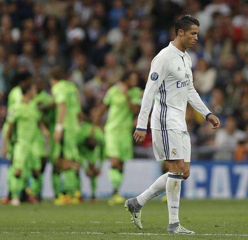 Real Madrid's Cristiano Ronaldo walks away as Sporting players, rear, celebrate scoring their side's first goal during a Champions League, Group F soccer match between Real Madrid and Sporting, at the Santiago Bernabeu stadium in Madrid, Spain, Wednesday, Sept. 14, 2016. (AP Photo/Daniel Ochoa de Olza) The Associated Press