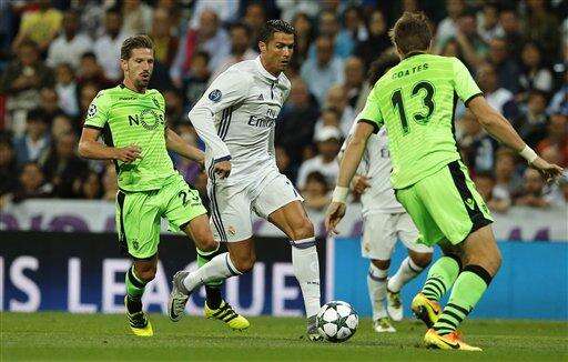 MADRID (AP) - Cristiano Ronaldo and Alvaro Morata scored very late goals as Real Madrid came from behind to beat Sporting Lisbon 2-1 and avoid starting the defense of its Champions League title with a shock defeat on Wednesday.