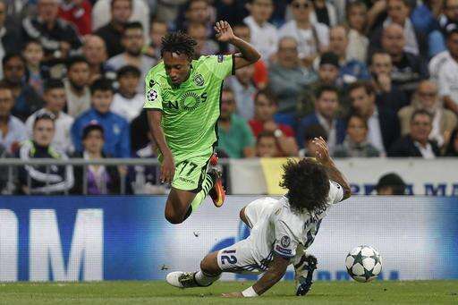 Real Madrid's Marcelo intercepts with a sliding while Sporting's Gelson Martins jumps to avoid colliding during a Champions League, Group F soccer match between Real Madrid and Sporting, at the Santiago Bernabeu stadium in Madrid, Spain, Wednesday, Sept. 14, 2016. (AP Photo/Daniel Ochoa de Olza) The Associated Press