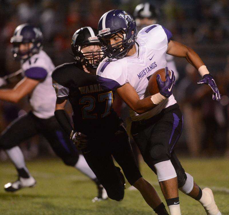 Mustangs wide receiver Jose Camacho tries to get away from Maine West defenders after a catch in the first half.
