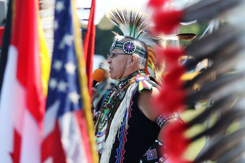 As drums thundered, dancers wearing buckskin dresses and feathers hanging from their hair moved in rhythm Sunday as they took part in the Grand Entry of the American Indian Center of Chicago's 63rd annual Powwow at Busse Woods in Elk Grove Village.