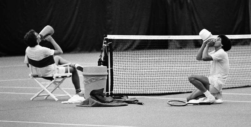 Two players take a break in between sets during the state high school tennis tournament in May of 1976 at Arlington High School.