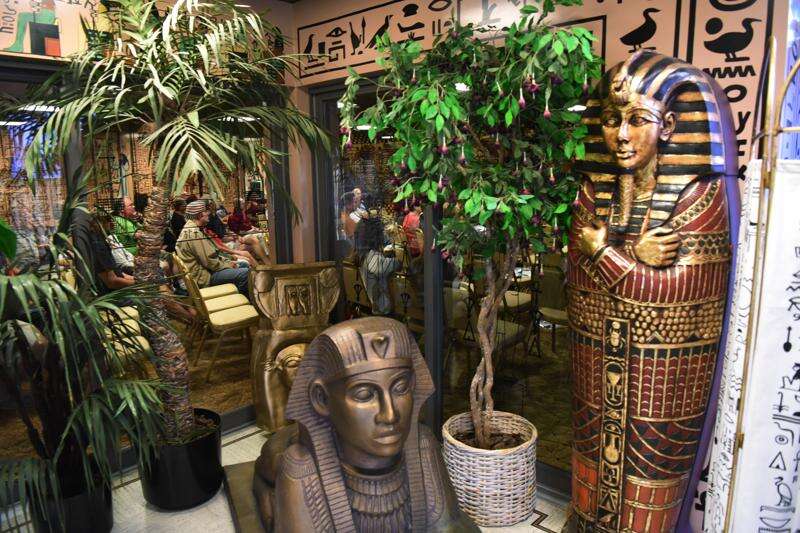 Egyptian decor is seen in the front foyer of the Gold Pyramid House in Wadsworth Saturday, as guests in the next room listen to a lecture about the history of the house during the Stand UP for Veterans event to benefit Midwest Veterans Closet.