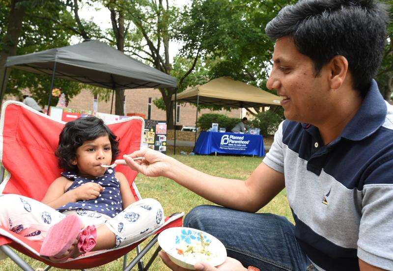 Suprita Matcha, 2, gets some help from her father Arun of Naperville while eating upma Saturday during the Indian Cultural Festival in Naperville. Upma is a traditional Indian breakfast food. Paul Michna/pmichna@dailyherald.com