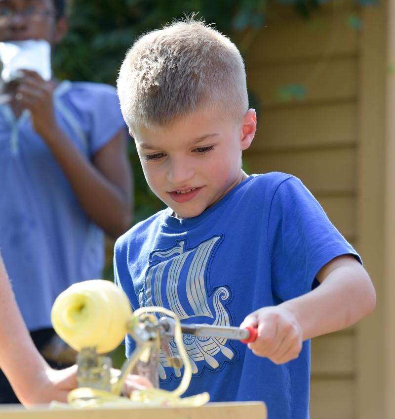 Anson Brazier, 7, of Glen Ellyn peels an apple 1840s style Sunday during the Glen Ellyn Historical Society's annual Tavern Day. Mark Black/mblack@dailyherald.com