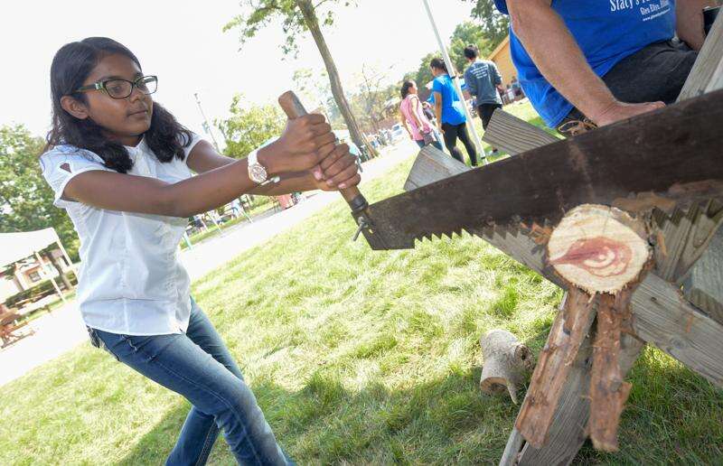 Arya Nade, 11, of Glen Ellyn tries out a bow saw Sunday with friend and classmate Adriana Denwood, during the Glen Ellyn Historical Society's annual Tavern Day. Mark Black/mblack@dailyherald.com