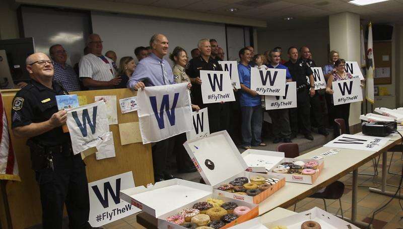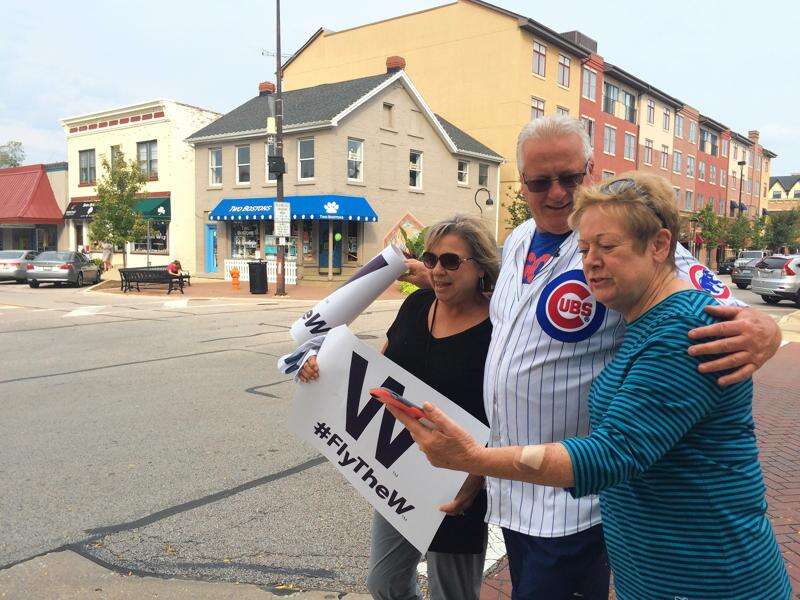 Hall-of-Famer Ryne Sandberg and the Cubs mascot, Clark, meanwhile, handed out posters in Lake Bluff and Chicago for what the team's front office is calling the #FlyTheW Rolling Rally.