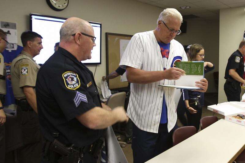 Trout surprised fans and handed out doughnuts to Naperville police officers Wednesday to build support as the Cubs prepare to open their National League division series Friday night at Wrigley.