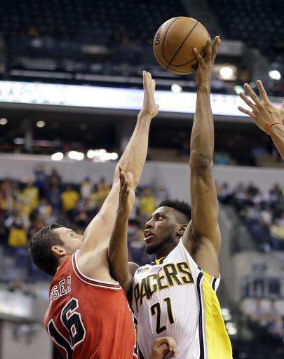 Indiana Pacers' Thaddeus Young (21) shoots over Chicago Bulls' Paul Zipser during the second half of an NBA preseason basketball game Thursday, Oct. 6, 2016, in Indianapolis. Indiana won 115-108. (AP Photo/Darron Cummings) The Associated Press