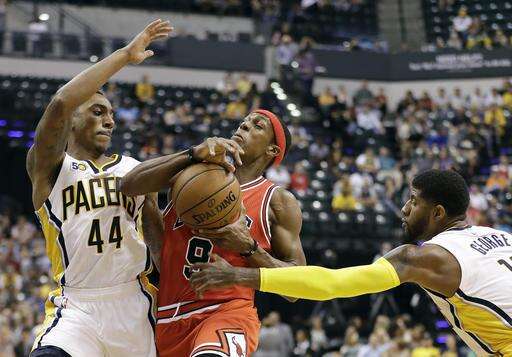 Chicago Bulls' Rajon Rondo (9) goes to the basket against Indiana Pacers' Jeff Teague (44) and Paul George (13) during the first half of an NBA preseason basketball game Thursday, Oct. 6, 2016, in Indianapolis. (AP Photo/Darron Cummings) The Associated Press