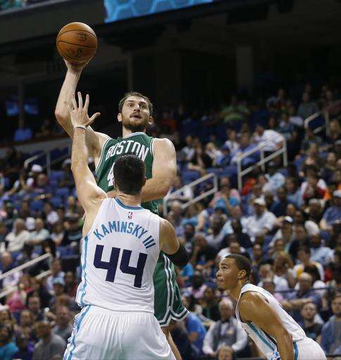 Boston Celtics center Tyler Zeller (44) goes up for a shot against Charlotte Hornets center Frank Kaminsky III (44) during the fourth quarter of a preseason NBA basketball game Thursday, Oct. 6, 2016, in Greensboro, N.C. (AP Photo/Brian Blanco) The Associated Press