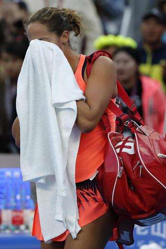 Madison Keys of the United States covers her face with a tower leaves the court after her defeat by Johanna Konta of Britain in the women's singles semifinals of the China Open tennis tournament at the Diamond Court in Beijing, Saturday, Oct. 8, 2016. (AP Photo/Andy Wong)