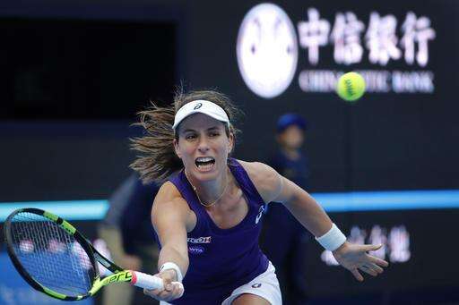 Johanna Konta of Britain hits a return shot against Madison Keys of the United States during the women's singles semifinals of the China Open tennis tournament at the Diamond Court in Beijing, Saturday, Oct. 8, 2016. (AP Photo/Andy Wong)
