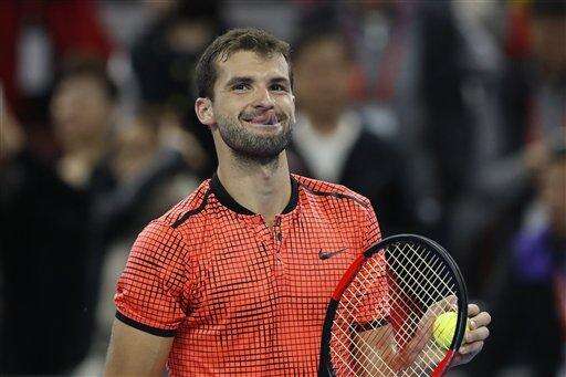 Gregor Dimitrov of Bulgaria celebrates after defeating Rafael Nadal of Spain in the men's singles quarterfinals of the China Open tennis tournament at the Diamond Court in Beijing, Friday, Oct. 7, 2016. (AP Photo/Andy Wong)